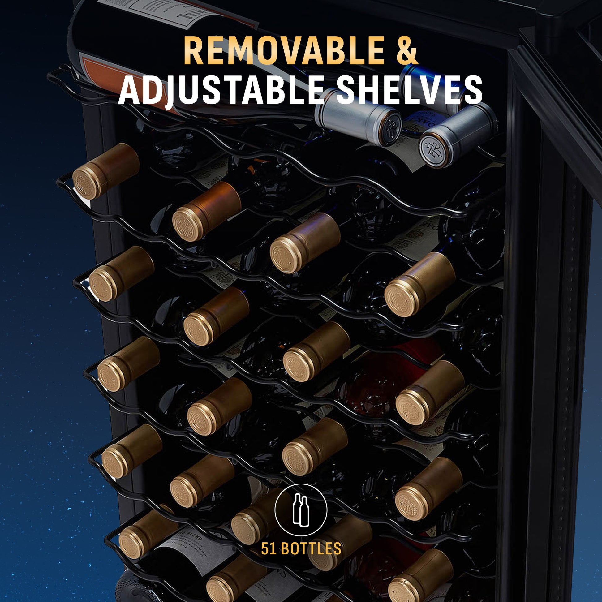 - Adjustable, removable shelves accommodate a range of bottles for collectors.