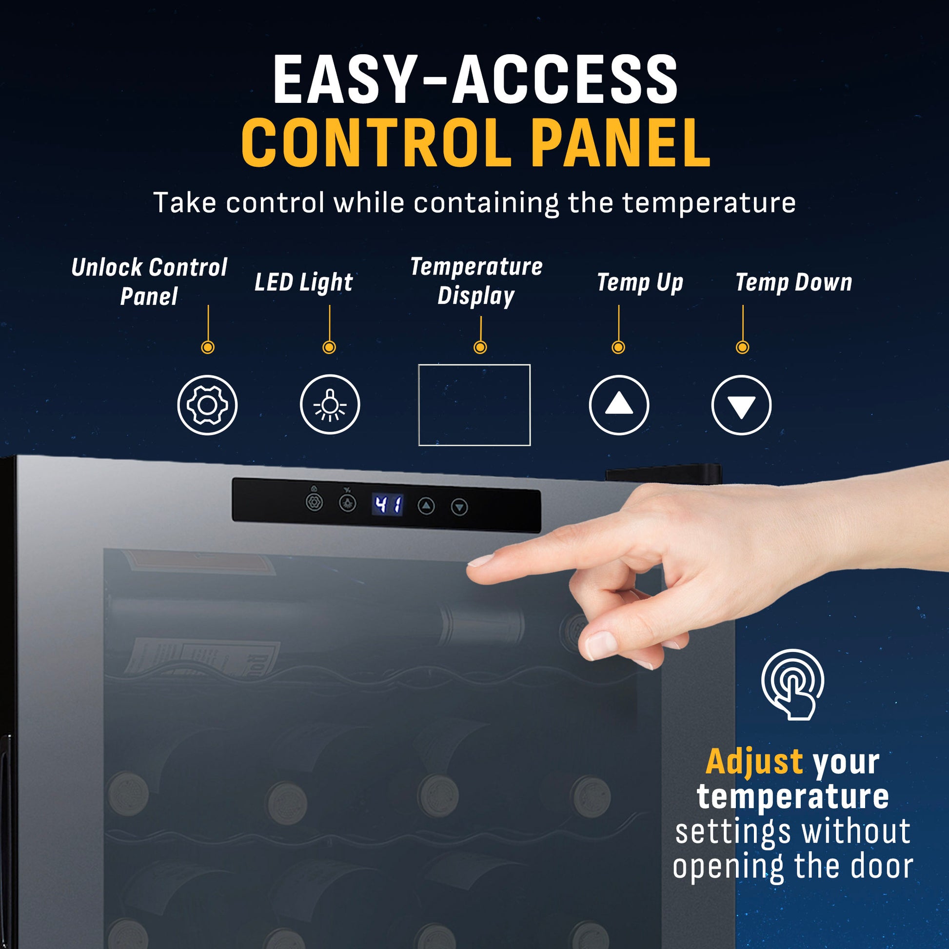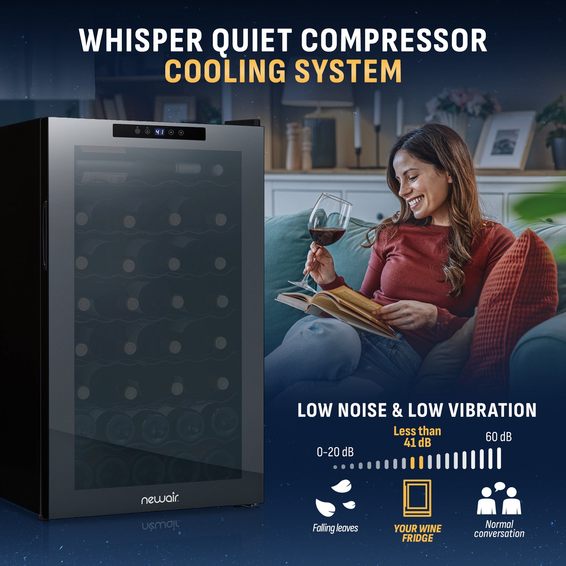 - Powerful and quiet compressor cooling keeps wine at 41 to 64 degrees to preserve flavor and aroma.