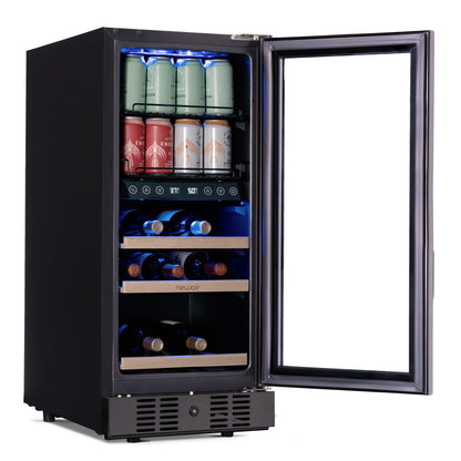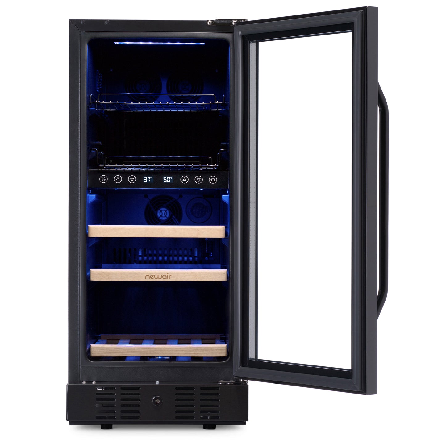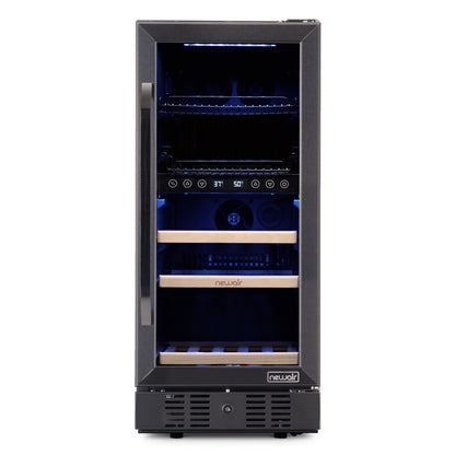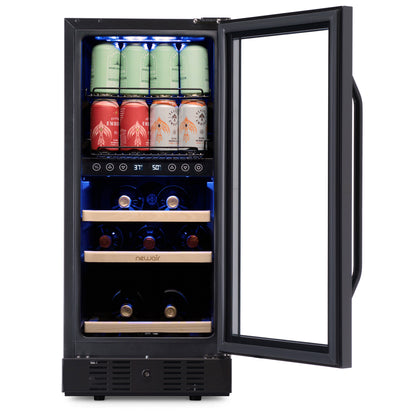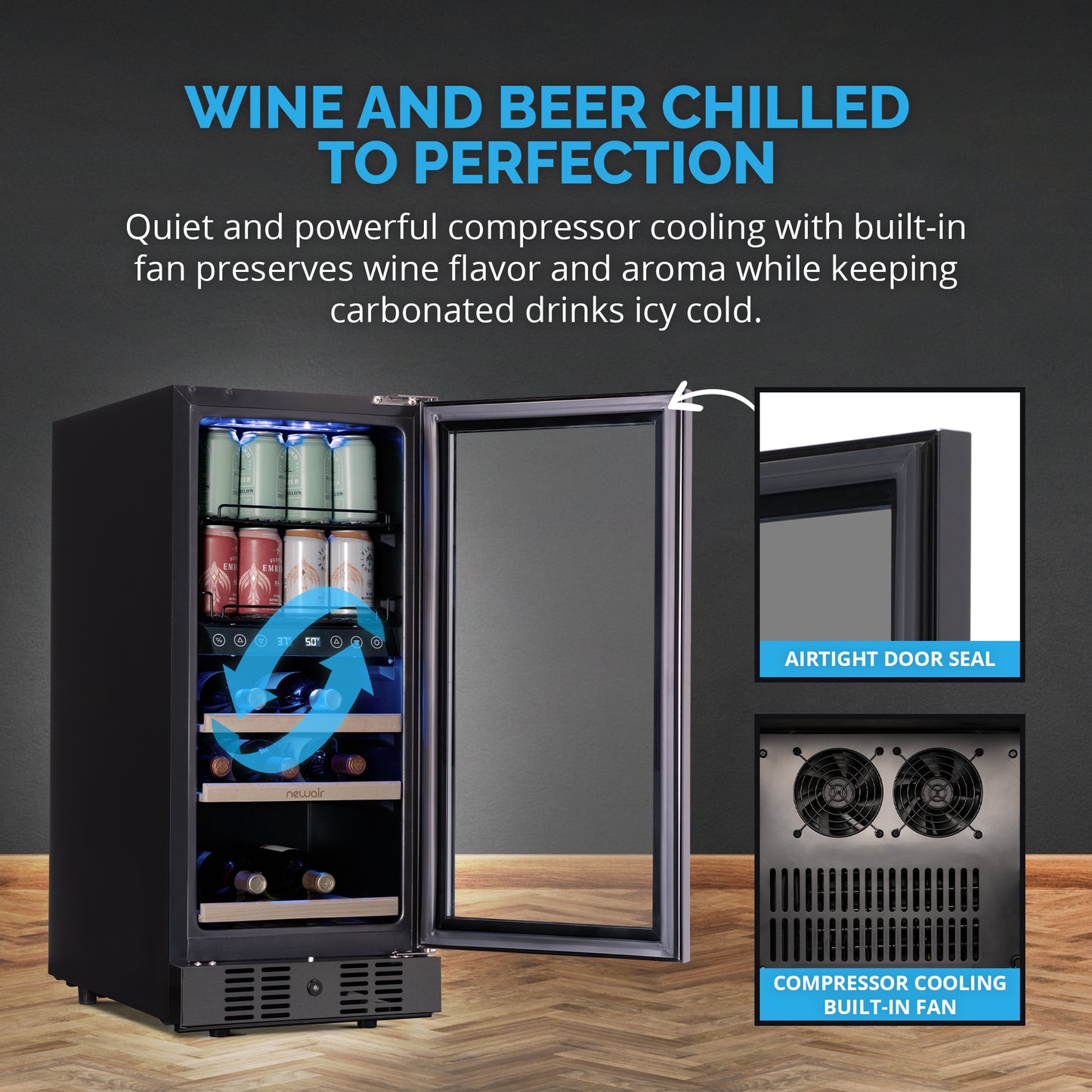 Entertain with elegance thanks to the Newair 15” dual-zone compact wine cellar, with a spacious beverage center, the only refrigerator of its kind on the market. It features the innovative SplitShelf™, which helps maximize storage space for taller beverages. This premium beverage cooler has two cooling zones to keep your wine at the perfect serving temperatures and carbonated drinks icy cold. The craftsman beech wood wine racks and seamless, black stainless-steel door are high-end details your guests won’t overlook. Now you can enjoy all your favorite wines and beverages in one space.