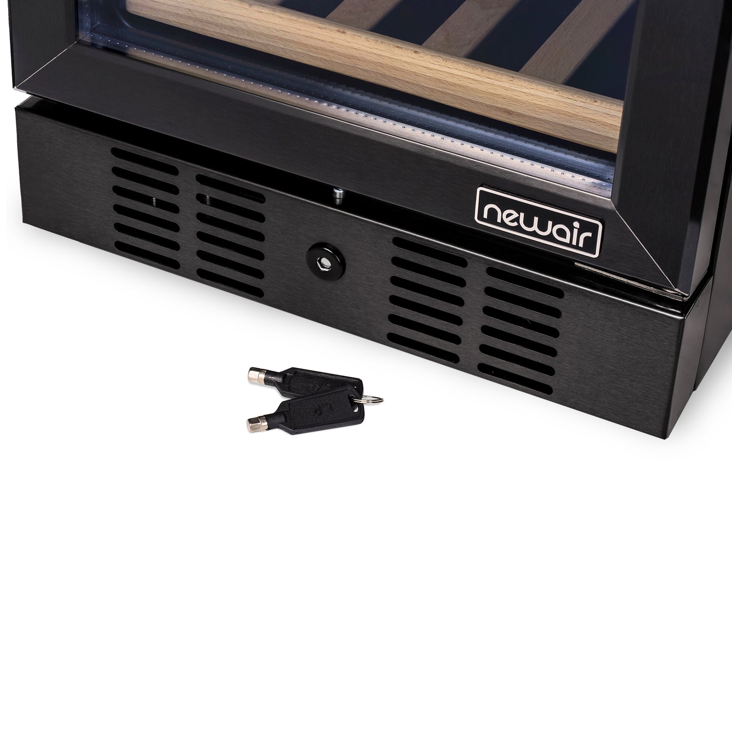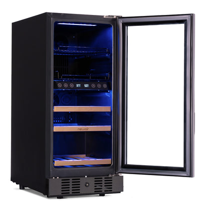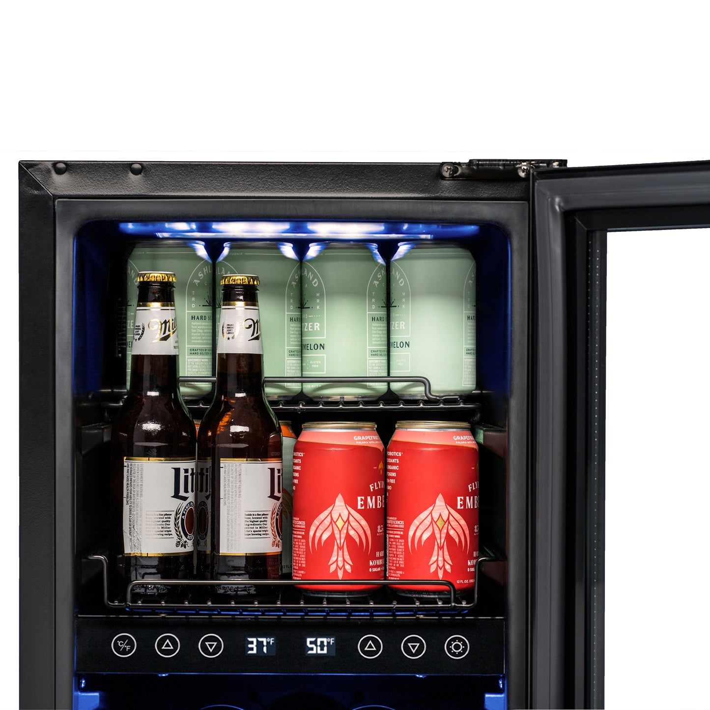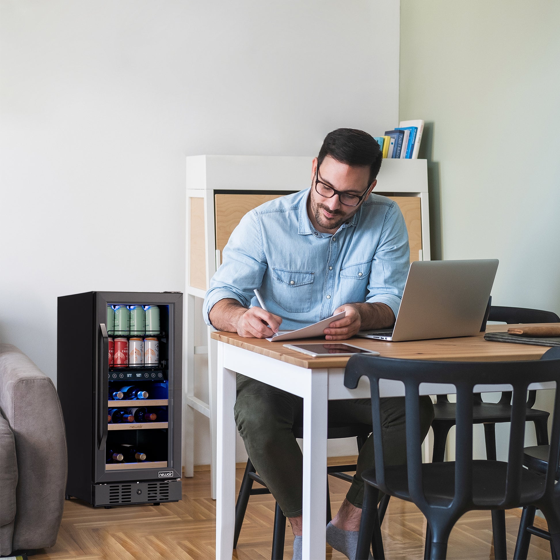 Entertain with elegance thanks to the Newair 15” dual-zone compact wine cellar, with a spacious beverage center, the only refrigerator of its kind on the market. It features the innovative SplitShelf™, which helps maximize storage space for taller beverages. This premium beverage cooler has two cooling zones to keep your wine at the perfect serving temperatures and carbonated drinks icy cold. The craftsman beech wood wine racks and seamless, black stainless-steel door are high-end details your guests won’t overlook. Now you can enjoy all your favorite wines and beverages in one space.