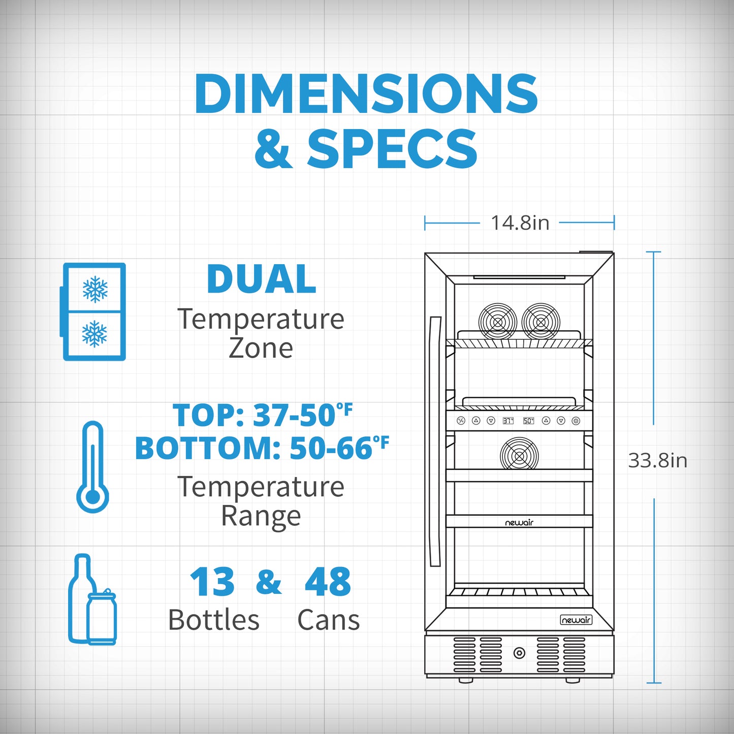Beverages or wine? Now you can store both. The Newair 15” dual zone compact wine cellar, with a spacious beverage center, is the only refrigerator of its kind on the market. It features the innovative SplitShelf™, which helps maximize storage space for taller beverages. With two temperature zones in one fridge, you can keep up to 13 wine bottles on the bottom and up to 48 standard beer or soda cans on the top. Use the digital temperature control to keep wine from 50 to 66 degrees and carbonated drinks at a refreshing 37 to 50 degrees.