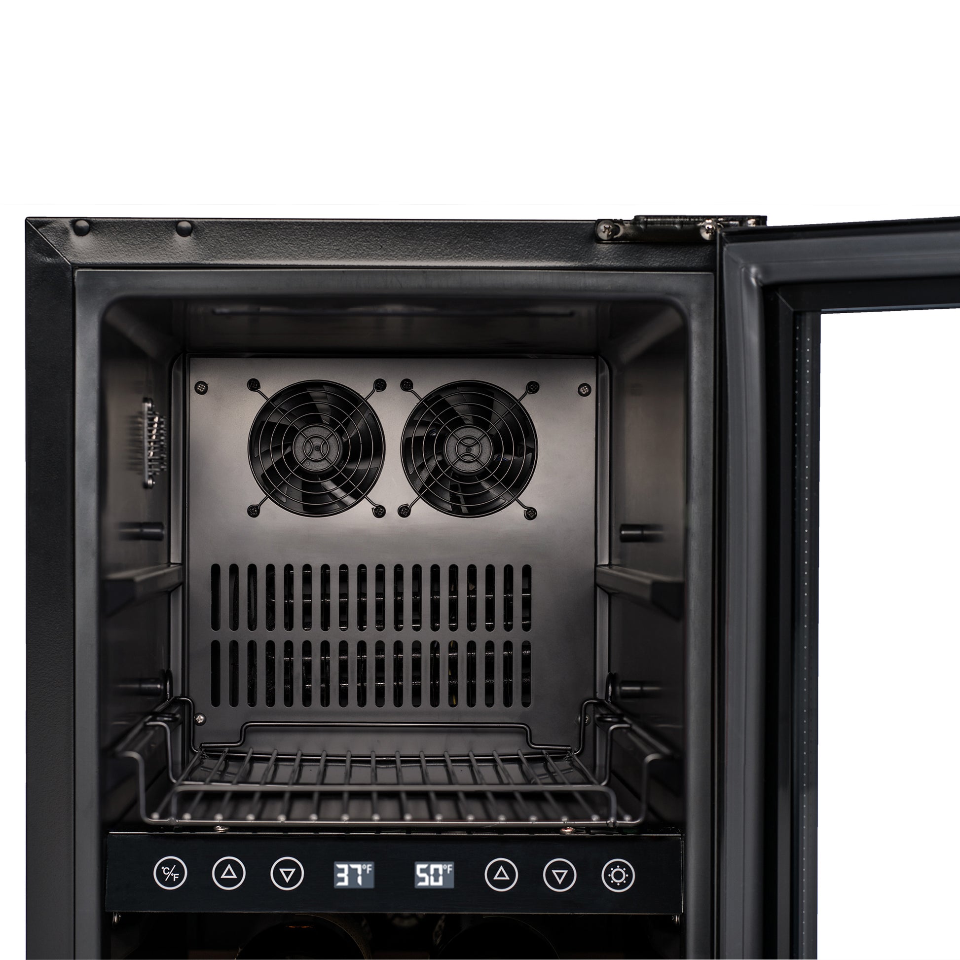 The front-venting compressor system allows you to slide this beverage refrigerator under any standard-height, 15” kitchen counter for a sleek, built-in look. It’s solid black sides and seamless black stainless-steel door also look great as a stand-alone appliance in your home office, studio apartment, mini bar, man cave and more.