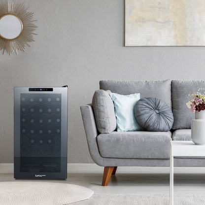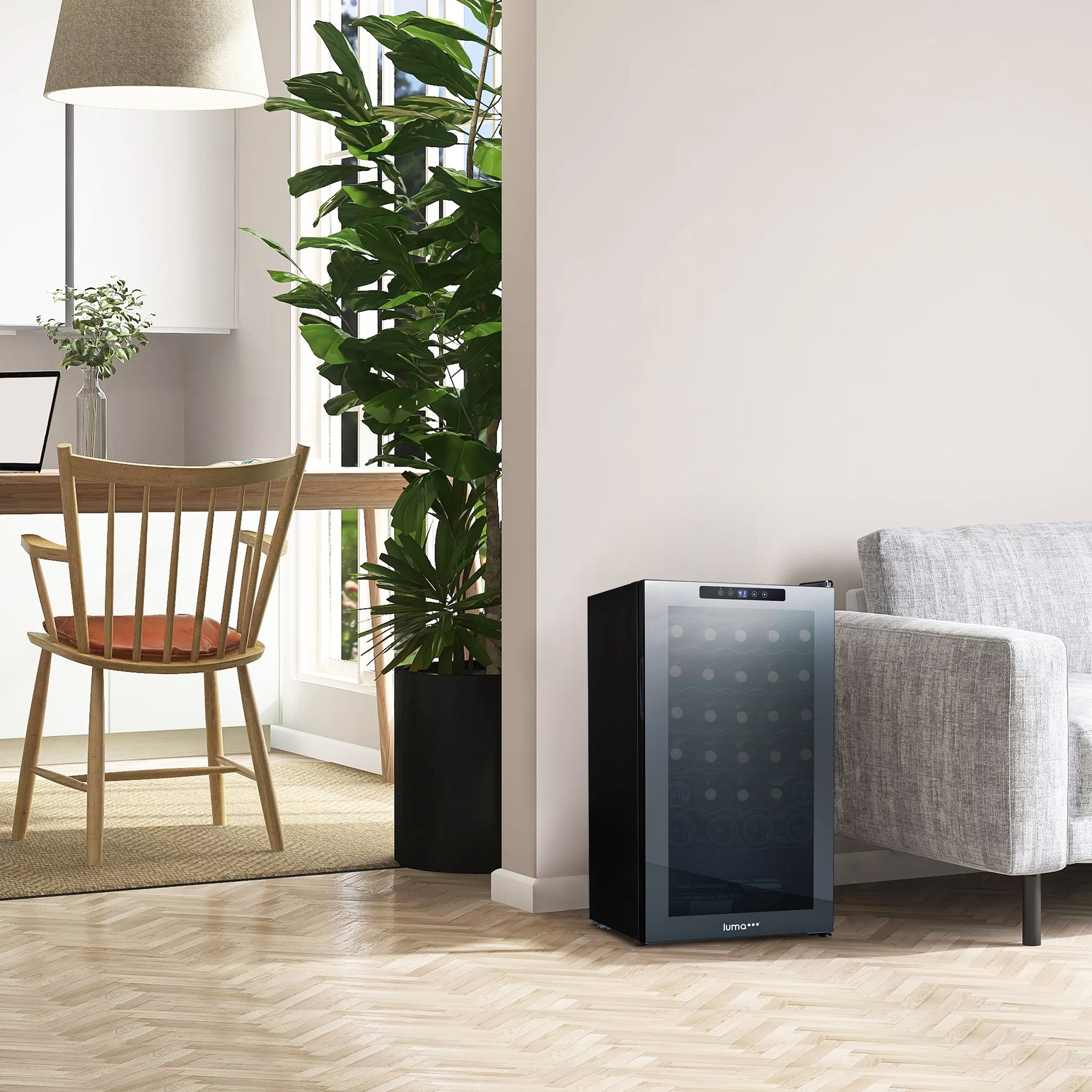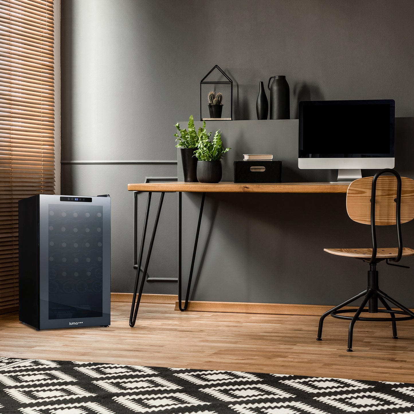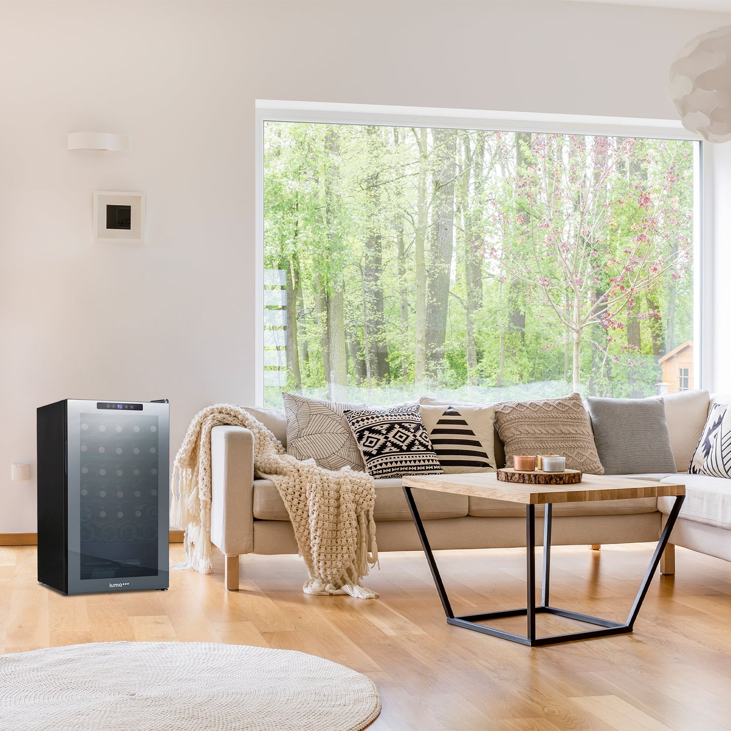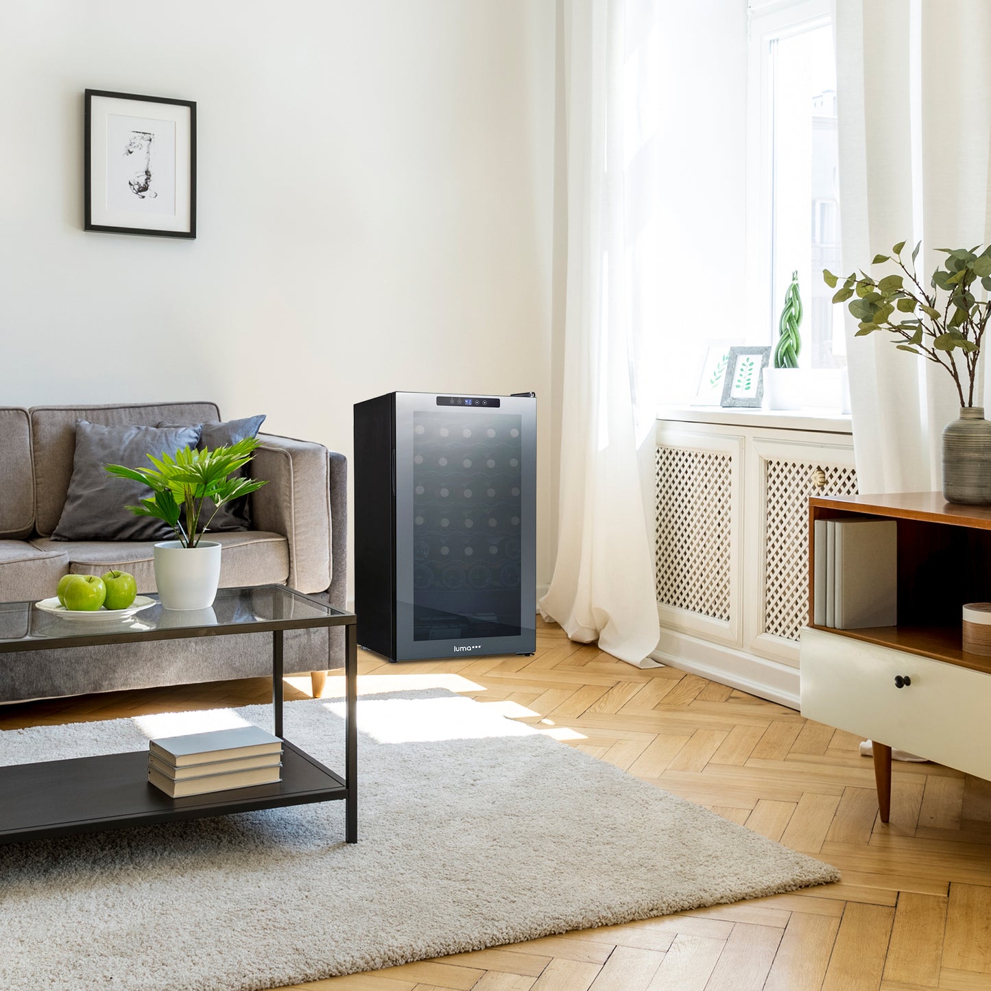 The Luma 18.7" 34-Bottle Black Freestanding Wine Fridge combines style and function with quiet cooling and adjustable shelves. Its sleek design, featuring a frameless mirrored glass door, ensures your wine collection is always ready for guests. The double-layer tempered glass door provides UV protection, preserving the flavor and aroma of your wines. Ideal for casual wine enthusiasts, this fridge offers a perfect blend of convenience and elegance.