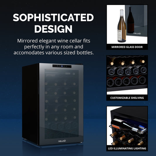 The Newair 34-Bottle Black Freestanding Wine Fridge features a frameless mirrored door ...Regular price $534.99Unit price perPay over time with Affirm. See if you qualify at checkout.