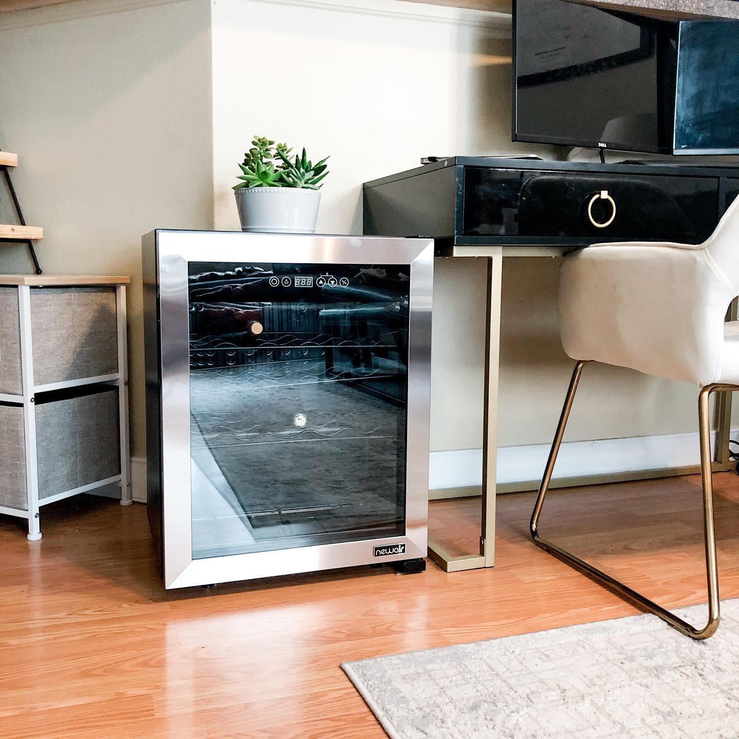 Bring modern wine storage to your kitchen, dining room, or home bar with the Newair® 23-Bottle Freestanding Wine Fridge. This compact unit offers quiet compressor cooling to preserve your wines between 41°F–64°F, while a smudge-resistant stainless steel finish adds a touch of elegance to any space. The double-pane glass door protects your collection from heat and UV rays, and the digital control panel makes temperature adjustments effortless. With adjustable black metal racks and soft LED lighting, it’s a smart, stylish solution for any wine lover.